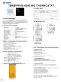 - Page 1: TDR89 WiFi Heating Thermostat is a WiFi touch screen thermostat with phone control. It is applied to temperature control of industrial, commercial, and domestic rooms, especially for floor heating systems. Power supply ranges from 100 to 240V with a current load of up to 16A for electric heating and 3A for water heating or gas boilers. The thermostat features a large screen display and touch button, power-off memory function, and real-time data save function. It supports a programmable schedule of 5+2, 6+1, or 7 days with six periods. The device includes a child lock function and three sensor modes that can be set. Manual mode allows for non-programmable temperature adjustments. The user interface includes settings for power on/off, temperature adjustment, clock setting, and programmable mode. The thermostat has a dimension of 86x90x14mm and operates within an ambient temperature range of 0-45°C. It is designed for easy installation in an 80mmx80mm European hidden box. The accuracy of the temperature setting is ±1°C.