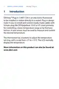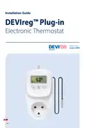 - Page 3: Installation guide for DEVIreg™ Plug-in. DEVIreg™ Plug-in (140F1134) is an electronic thermostat designed for indoor installation directly into a socket. The plug-in design allows for easy installation and connection of ready-made cables with Schuko plug. It is primarily used for controlling a lower temperature range for frost protection. A wire sensor is required to measure and control the desired temperature. The thermostat features buttons to adjust the temperature setting, with a scale from +3° to +15°C. The LCD normally displays the temperature. More information on this product can be found at the official website.