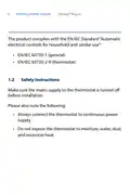 - Page 5: Installation guide for DEVIreg™ Plug-in. The product complies with the EN/IEC Standard for automatic electrical controls for household and similar use. Safety instructions include ensuring the mains supply to the thermostat is turned off before installation. Always connect the thermostat to continuous power supply. Avoid exposing the thermostat to moisture, water, dust, and excessive heat.