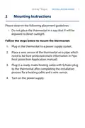 - Page 6: Mounting instructions provide placement guidelines for the thermostat. The thermostat should not be exposed to direct sunlight. To mount the thermostat, plug it into a power supply socket. Place a wire sensor of the thermostat on a pipe that needs frost protection. Plug in a ready-made heating cable with Schuko plug to the thermostat after installation. Turn on the power supply after completing the installation process.