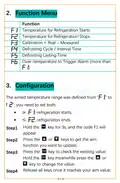- Page 2: Function section includes temperature settings for refrigeration starts and stops. Calibration is defined as real minus measured values. Defrosting cycle and interval time are specified. Defrosting lasting time is outlined. Over-temperature triggers an alarm if it exceeds a certain threshold. Configuration section details the aimed temperature range from F1 to F2. Refrigeration starts when the temperature is greater than or equal to F1. Refrigeration ends when the temperature is less than or equal to F2. Instructions are provided for updating settings using specific keys. Steps for adjusting values include holding keys and changing values as needed.