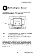 - Page 11: Set heating fan control. Set jumper JP1 on the back of the thermostat if you have connected a wire to the G terminal. Leave the jumper in the factory-set position if you have a gas or oil furnace. Place the jumper in this position if you have an electric furnace. An incorrect jumper setting is noticeable in a gas or oil heating system. When heating starts, you will initially feel cold air coming out of the vents. The fan runs before the furnace has enough time to heat up the air.