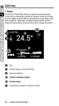 - Page 21: Použití termostatu. Dotkněte se tlačítka nastavení teploty pro přeregulaci aktuálního programu. Dotkněte se tlačítka menu pro vstup do hlavního menu. V hlavním menu zvolte jeden z provozních režimů nebo vstupte do menu Nastavení. Provozní režimy. Vypnuto - vypnete termostat. Adaptabilní dočasná přeregulace požadované teploty. Program pro dovolenou. Předem naprogramované a přizpůsobitelné úsporné programy. Více informací o použití termostatu a nastavení hlasového ovládání naleznete na nVent.com/RAYCHEM.